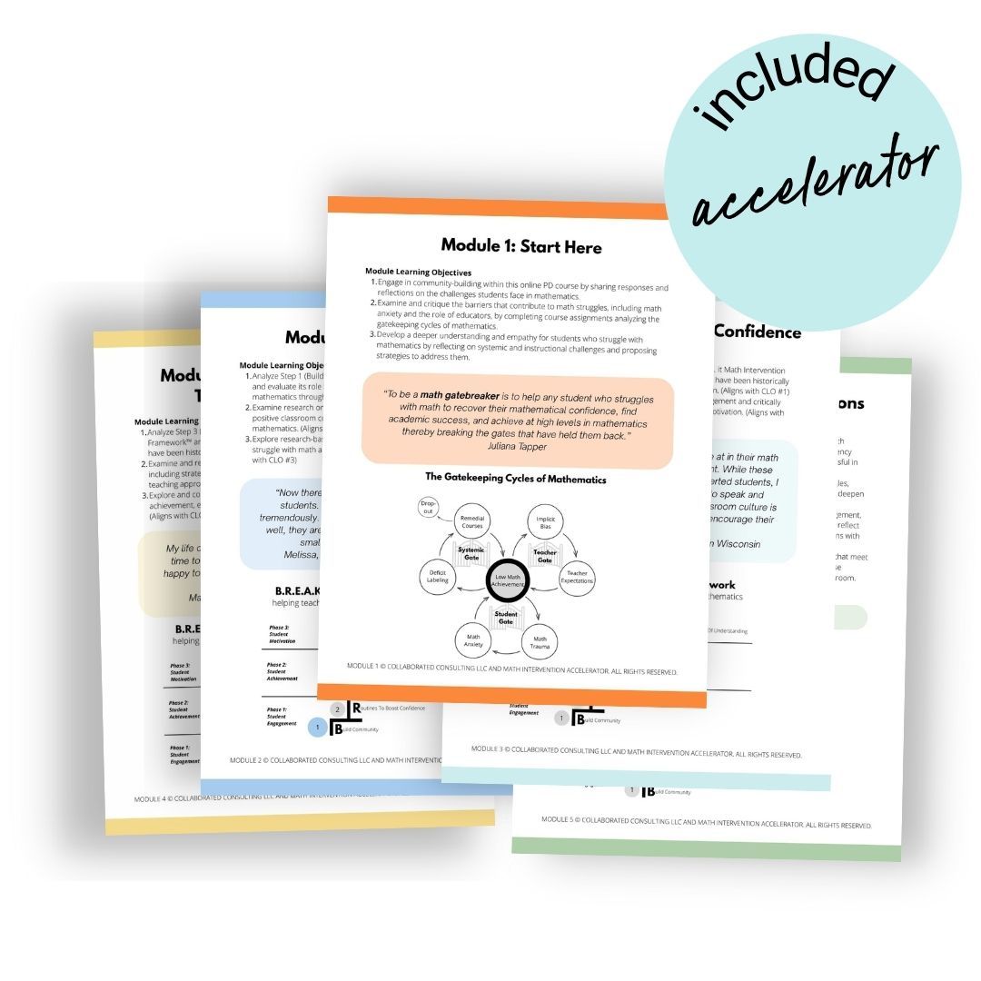 The Accelerator is your 5 step path for increasing engagement, achievement, and motivation of your students who have been historically unsuccessful in mathematics with the 6 modules that make up the B.R.E.A.K it Math Intervention Framework™️.